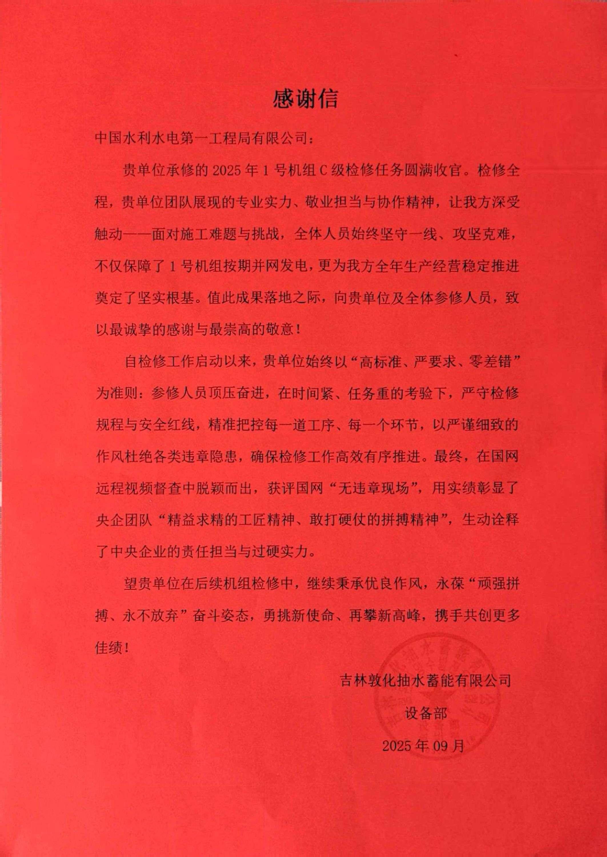 9月24日,機電檢修運維公司承修的吉林敦化抽水蓄能電站1號機組C級檢修工程圓滿完成,機組成功并網發電。 吉林敦化抽水蓄能電站坐落于吉林省敦化市北部,是目前東北地區裝機規模最大、吉林省首座純抽水蓄能電站。該電站總裝機容量達1400兆瓦,共安裝4臺單機容量350兆瓦的可逆式水泵水輪機組,在區域能源系統中發揮著重要作用。 本次1號機組C級檢修工作啟動以來,面對時間緊、任務重的雙重考驗,檢修團隊始終以“高標準、嚴要求、零差錯”為核心準則,頂壓奮進、攻堅克難。施工期間,團隊嚴格遵守檢修規程與安全紅線,對每一道工序、每一個環節進行精準把控,以嚴謹細致的工作作風全面排查并杜絕各類違章隱患,確保檢修工作高效、有序推進。最終,在國家電網公司遠程視頻督查中脫穎而出,成功獲評國網“無違章現場”稱號,同時收到業主單位贈送的錦旗一面與感謝信一封,充分彰顯了業主對檢修工作的高度認可。 此次檢修工程的圓滿完成,不僅保障了1號機組按期并網發電、恢復穩定運行,更為敦化電站全年生產經營目標的穩步推進奠定了堅實基礎。檢修團隊以實際行動,生動詮釋了央企隊伍“精益求精的工匠精神、敢打硬仗的拼搏精神”。 展望后續工作,檢修團隊將繼續傳承優良工作傳統,秉承“頑強拼搏、永不放棄”的優秀作風,以更飽滿的熱情迎接新挑戰,砥礪前行、再創佳績,為能源事業高質量發展貢獻力量! |